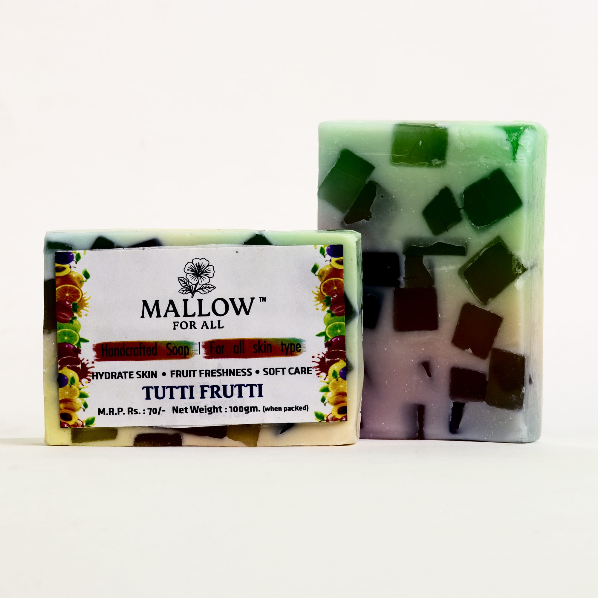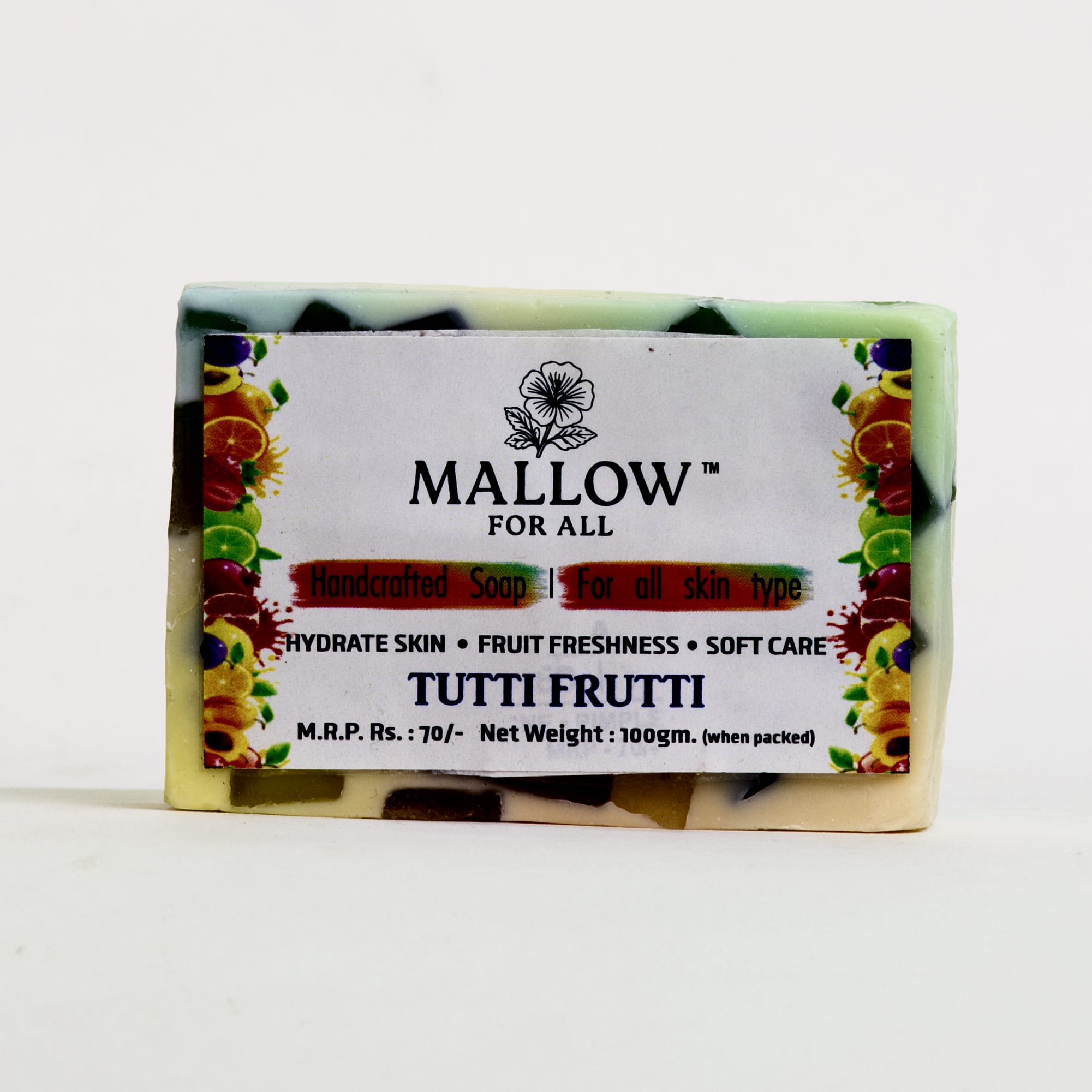 Mallow For All Tutti Frutti Soap is a vibrant, fruit-enriched handcrafted bar that deeply hydrates, softens, and refreshes the skin with a burst of natural fruity fragrance. Chemical-free and suitable for all skin types — a fun, nourishing treat for your daily skincare routine.